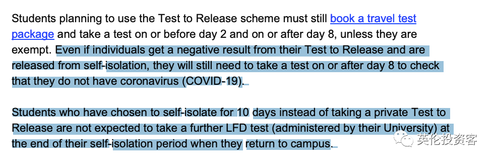 虽然隔离可以提前解除,但是学生们仍需支付旅行测试包的费用,在隔离第2、8天的时候分别进行一次核酸检测,以确认是否被感染。没有使用私人核酸检测项目、且隔离满10天的学生,无需在返校前接受由学校开展的LFD新冠测试。