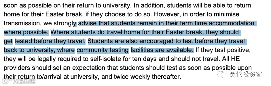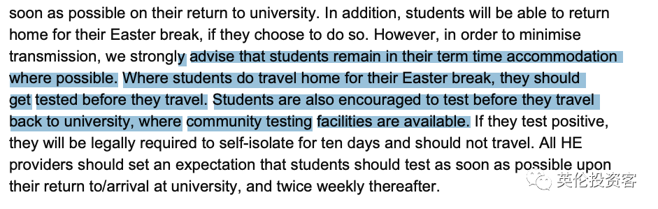针对英格兰地区本土大学生来说,他们复活节假期是可以选择回家的,但是政府强烈建议学生们尽可能的呆在宿舍里。
