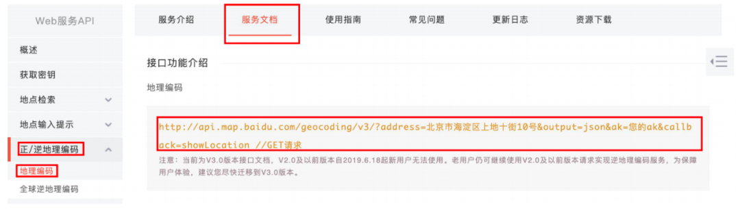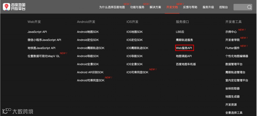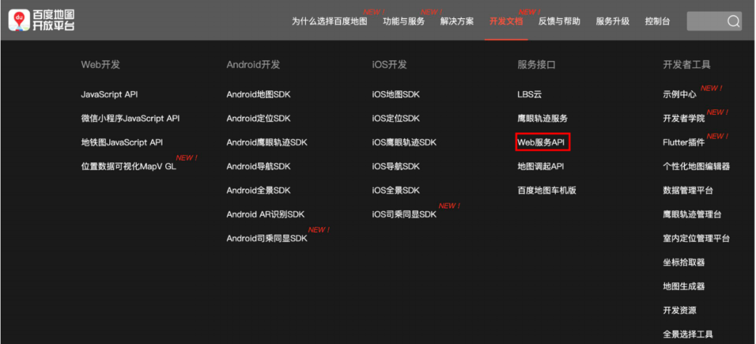 首先,我们要找到正确的url以及请求参数的设置,我们下拉页面上方的“开发文档”,选择“Web服务API”。