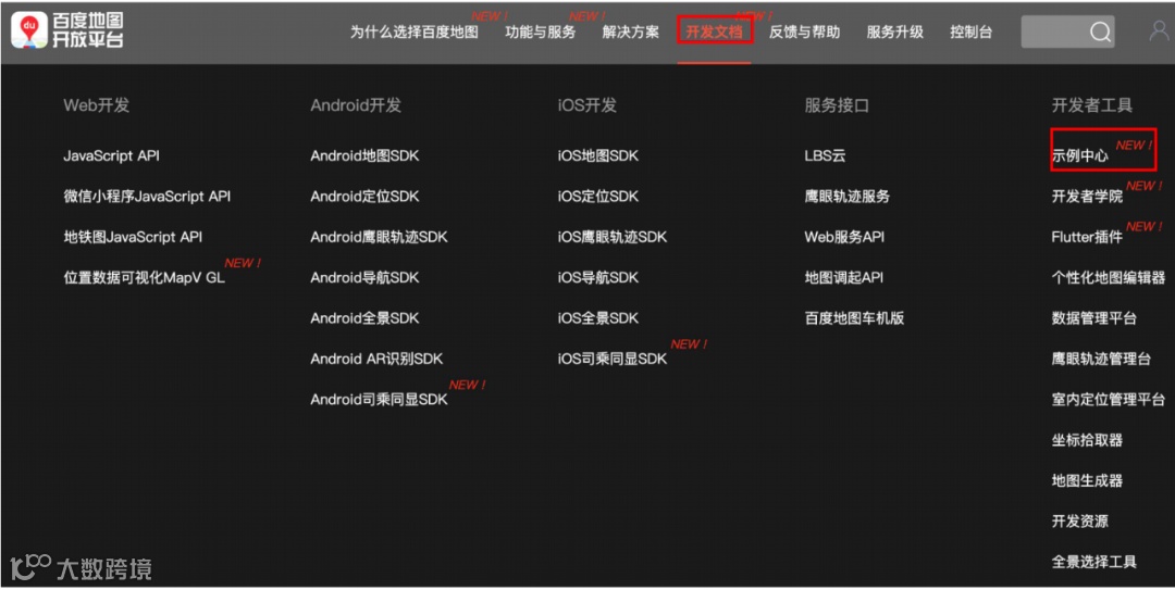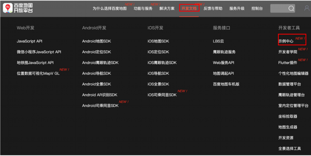 首先,我们下拉“开发文档”,选择“示例中心”选项。