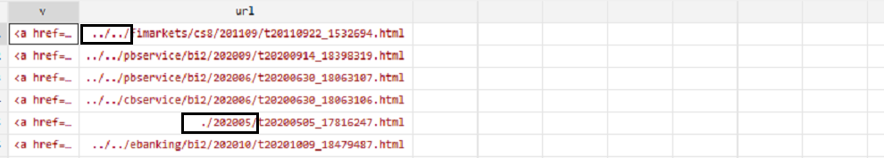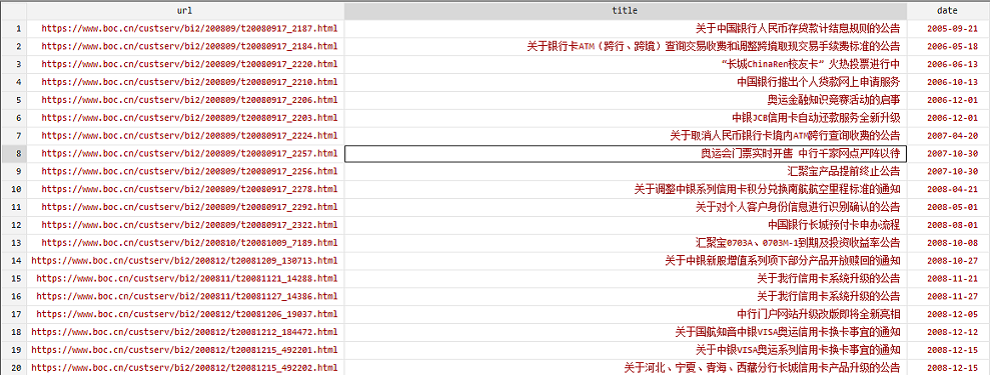 clear allcap mkdir d:/fileexistscd d:/fileexistsforvalues j=1/37{cap copy "https://www.boc.cn/custserv/bi2/index_`j'.html" temp`j'.txt,replacewhile fileexists("temp`j'.txt") == 0 {sleep 5000cap copy "https://www.boc.cn/custserv/bi2/index_`j'.html" temp`j'.txt,replace}infix strL v 1-10000 using "temp`j'.txt",clear //观察后不用进行转码,可直接进行下一步forvalues i=`=_N'(-1)2{if index(v[`i'],"</li>") & !index(v[`i'],"</a>") {replace v=v+v[`i'] in `=`i'-1'drop in `i'}} //按某种标志进行合并keep if index(v,"</span></li>")gen url=ustrregexs(1) if ustrregexm(v,`"<a href="(.*?)""')forvalues k=1/`=_N' {if ustrregexm(url[`k'],"^../../"){replace url= "https://www.boc.cn"+substr(url,6,.) in `k'}if ustrregexm(url[`k'],"^./"){replace url= "https://www.boc.cn/custserv/bi2/"+substr(url,3,.) in `k'}} //两种不同的链接,分类进行处理。gen title=ustrregexs(1) if ustrregexm(v,`"title="(.*?)""')gen date=ustrregexs(1) if ustrregexm(v,"<span>(.*?)</span>")replace date=substr(date,3,11)drop vsave title_`j',replace}clearforvalues i=1/37{append using title_`i'}sort datesave title_total,replace