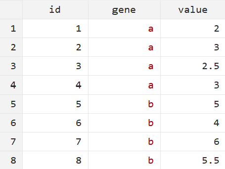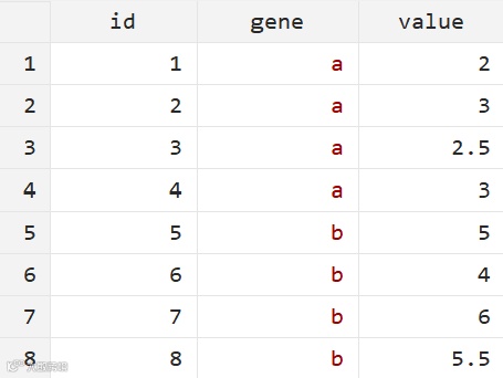很容易理解,多对一就是将多列数据划为一列,这在什么时候需要用到呢?比如说绘制图形之前,第一步需要将宽数据转换成长数据,我们以下面的例子为例。