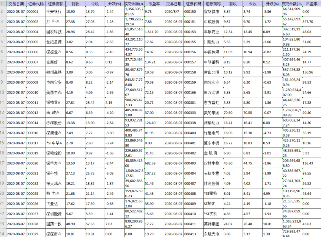 多列转化成多列的使用:我们以股票行情显示为例,比如说网站上为了方便,减小篇幅地展示当日所有股票的行情,会以8列为一单位分别展示出交易日期、证券代码、证券简称、前日收盘价、今日收盘价、涨跌幅度、成交金额及市盈率,然后9-16列会以同样的顺序展示股票行情,如下图: