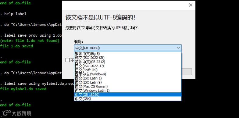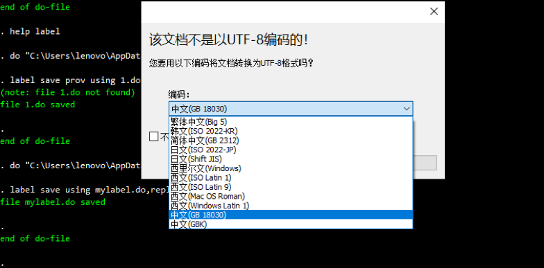 这条命令的意思是将值标签的定义保存在一个do文件中,其中lblname是用来指定要保存值标签的变量名,如果不进行指定,则默认保留全部。当我们得到这个do文件后,在Stata中选择用中文编码方式打开,运行即可完成标签转码工作。过程如下: