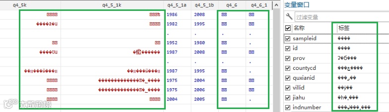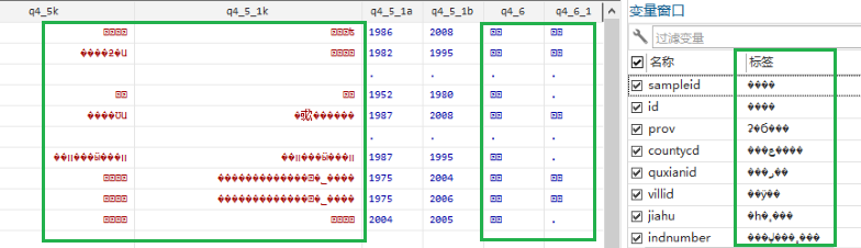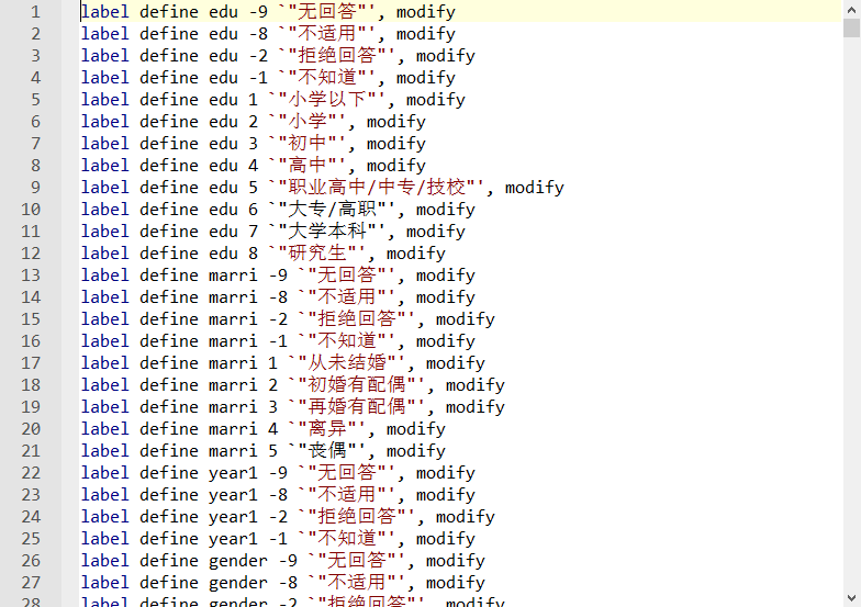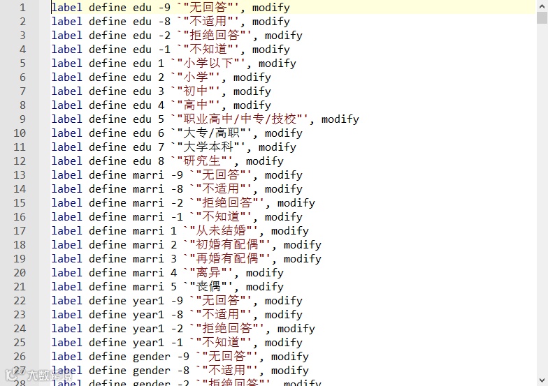接下来要介绍的就是数值型变量值标签的转码,即数据中的蓝色乱码部分,这部分继续用ustrfrom()很难实现,和上面提到的有些不同。这时我们用到的就是label save命令,具体格式如下: