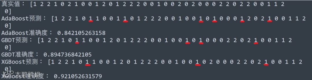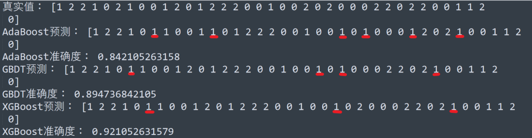 from sklearn.datasets import load_irisfrom sklearn.model_selection import train_test_splitfrom sklearn.ensemble import AdaBoostClassifier, GradientBoostingClassifierfrom xgboost.sklearn import XGBClassifierfrom sklearn.metrics import accuracy_scoreiris_sample = load_iris()x_train, x_test, y_train, y_test = train_test_split(iris_sample.data, iris_sample.target, test_size=0.25, random_state=123)print('真实值:', y_test)# AdaBoost分类adbclf = AdaBoostClassifier(learning_rate=0.1, n_estimators=100)adbclf.fit(x_train, y_train)y_adb_pre = adbclf.predict(x_test)print('AdaBoost预测:', y_adb_pre)print('AdaBoost准确度:', accuracy_score(y_test, y_adb_pre))# GBDT分类gbdtclf = GradientBoostingClassifier(max_depth=5, learning_rate=0.7, n_estimators=100)gbdtclf.fit(x_train, y_train)y_gbdt_pre = gbdtclf.predict(x_test)print('GBDT预测:', y_gbdt_pre)print('GBDT准确度:', accuracy_score(y_test, y_gbdt_pre))# XGBoost分类xgbclf = XGBClassifier(max_depth=5, learning_rate=0.7,n_estimators=100, objective='multi:softmax')xgbclf.fit(x_train, y_train)y_xgb_pre = xgbclf.predict(x_test)print('XGBoost预测:', y_xgb_pre)print('XGBoost准确度:', accuracy_score(y_test, y_xgb_pre))