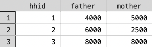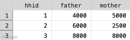 input hhid father mother //创建一个记录家庭成员收入的数据