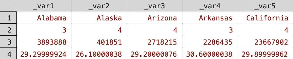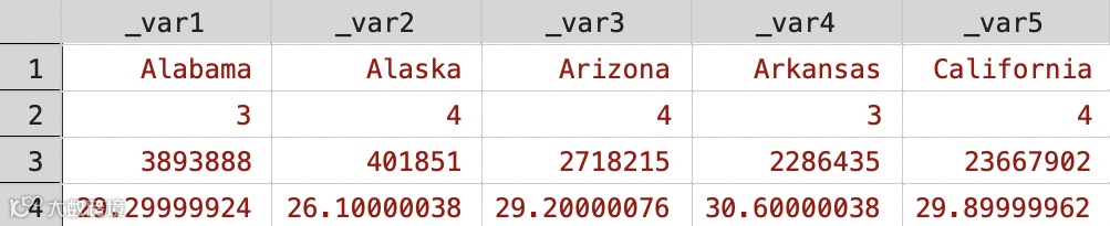 ④firstnames:将原始数据的第一列设置为转置后数据的变量名称;