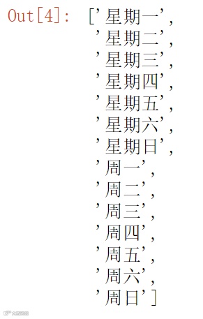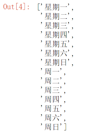给定list5=["星期","周"],list6=["一","二","三","四","五","六","七"],用列表生成式生成一个新列表list7,将新列表中元素为list5,list6对应位置元素相加,代码如下: