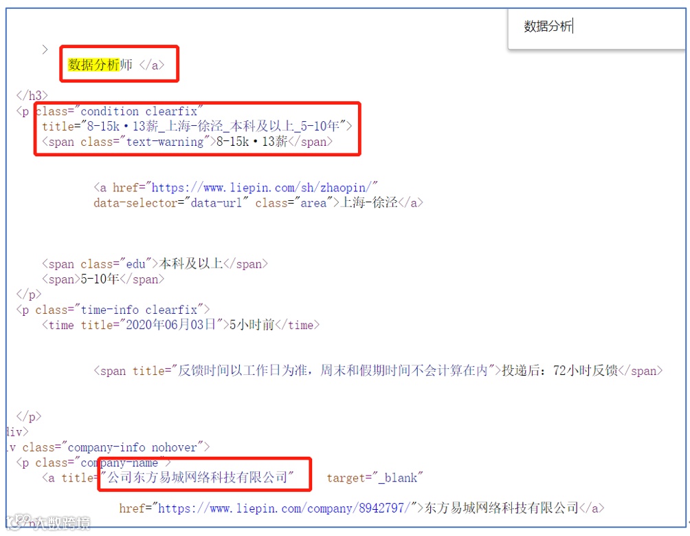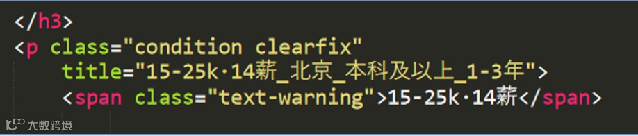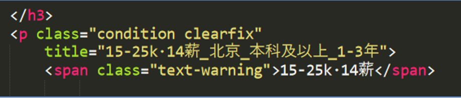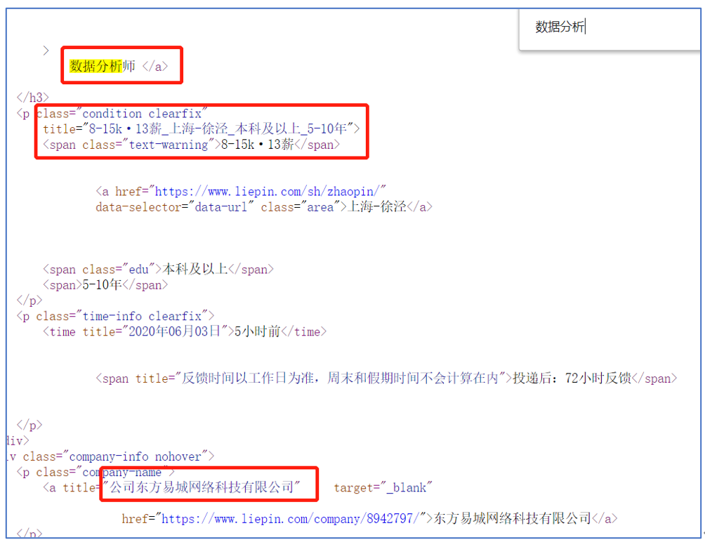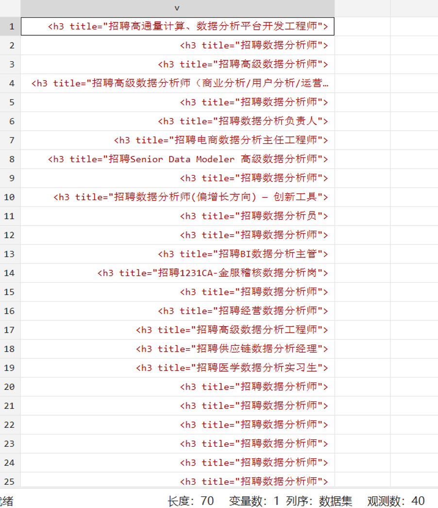 此时职位信息都在包含“<h3 title="招聘”字符串的行。使用正则表达式保留满足这个条件的行观测值,就得到包含职位名称信息的行,得到结果如图所示。