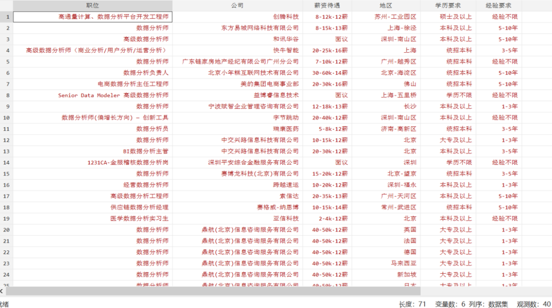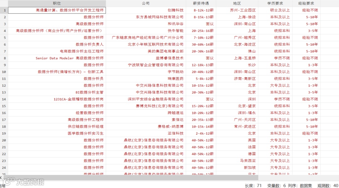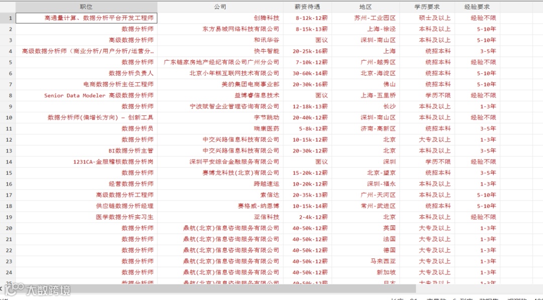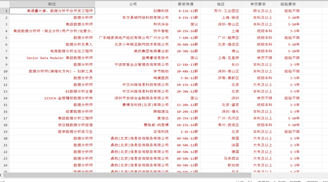 这样,我们就得到“猎聘网”全部“数据分析”职位的薪资信息了。薪资水平哪家强?快来试试吧~