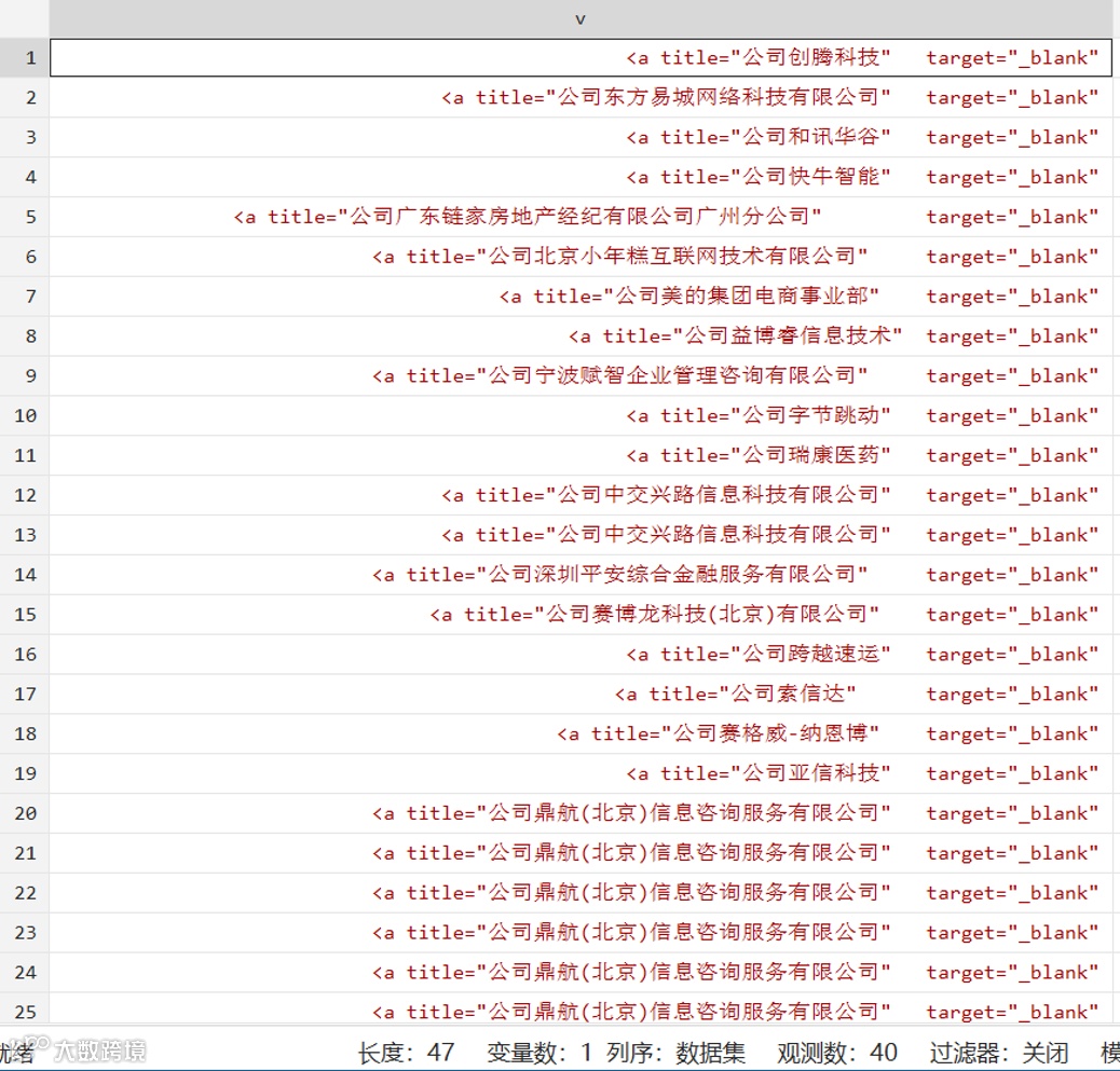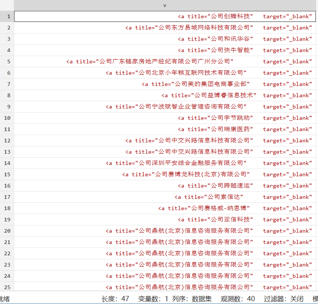 此时公司信息都在包含“<a title="公司”字符串的行。使用正则表达式保留满足这个条件的行观测值,就得到包含公司信息的行,结果如图所示。