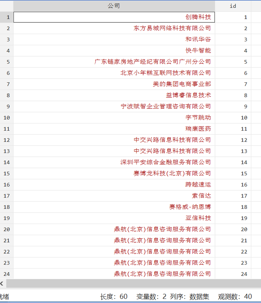 得到所需信息后,对其进行数据清洗,不同于薪资信息,公司名称之前都多出“公司”二字,使用字符串函数“substr”对其进行截取,其他操作同上,得到公司名称信息。