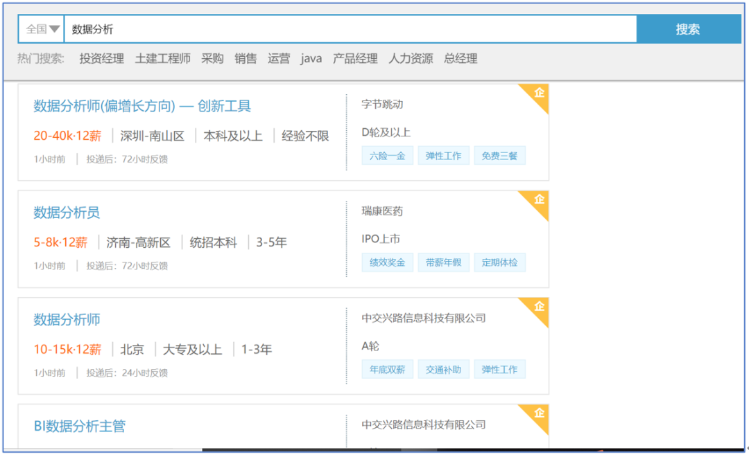 “度娘”告诉我们——“这是一个用数据说话的时代,也是一个依靠数据竞争的时代。世界500强企业中,有90%以上都建立了数据分析部门。IBM、微软、Google等知名公司都积极投资数据业务,建立数据部门,培养数据分析团队。各国政府和越来越多的企业意识到数据和信息已经成为企业的智力资产和资源,数据的分析和处理能力正在成为日益倚重的技术手段。”无疑,数据分析职业成为许多人朝夕拼搏的职业目标。那炙手可热的数据分析职位的薪资待遇如何?各大公司对数据分析职位的基本要求又有哪些?今天,小编就带着这个问题为大家答疑解惑。