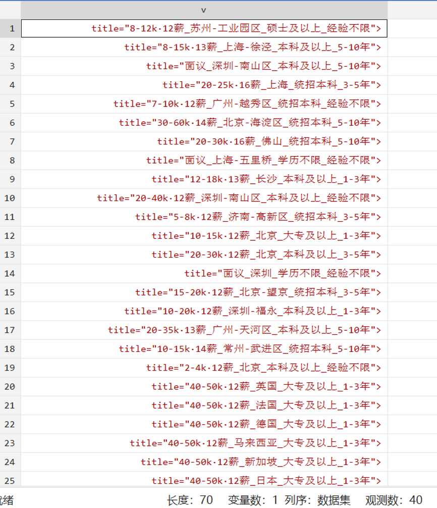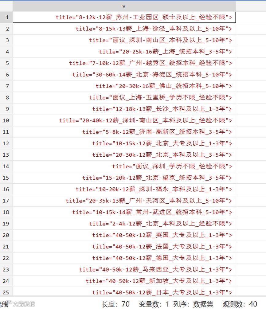 可以发现薪资待遇、地区、学历要求、经验要求都在一个以“title="”开头,以“">”结尾的字符串之间。将文本信息导入Stata软件,使用正则表达式保留满足这个条件的行观测值,就得到包含薪资信息的行,得到结果如图所示。