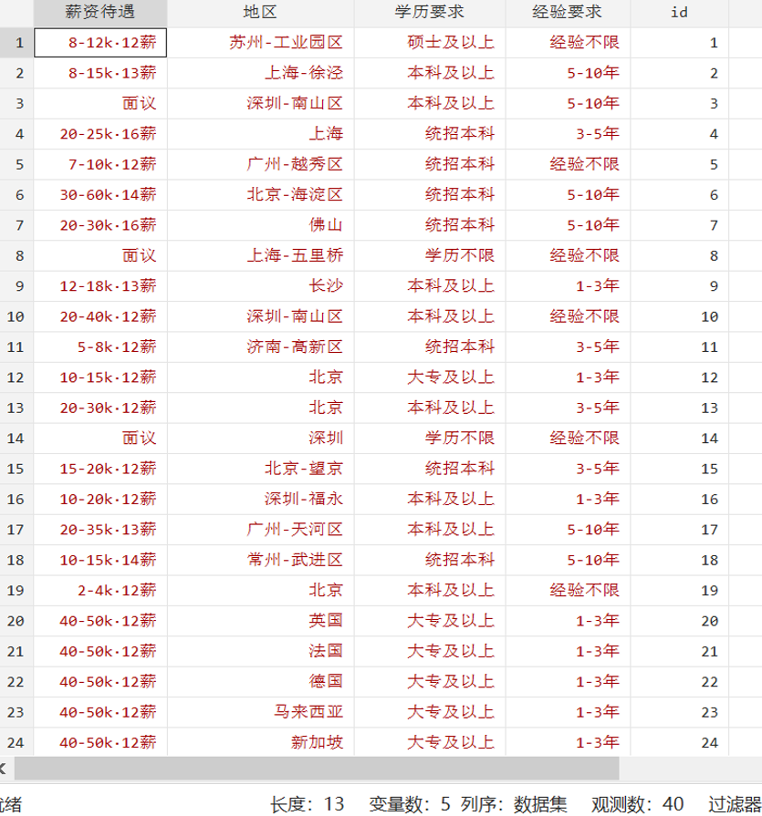 得到所需信息后,对其进行数据清洗,包括变量一列变多列、重命名、保存备用等操作得到薪资信息如下。