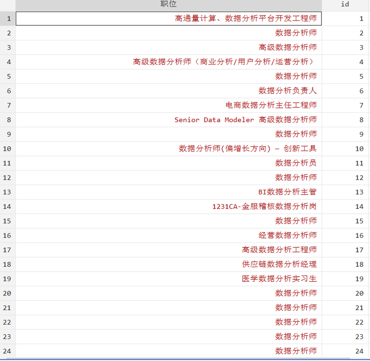 得到所需信息后,对其进行数据清洗,职位名称也多出“招聘”字样,同样使用字符串函数“substr”对其进行截取,其他操作同上,得到职位名称信息。
