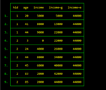 input hid age gender income1 44 1 90001 41 0 80001 20 0 50002 83 1 20002 85 0 20002 45 1 60002 44 0 80002 24 1 40002 3 0 0end