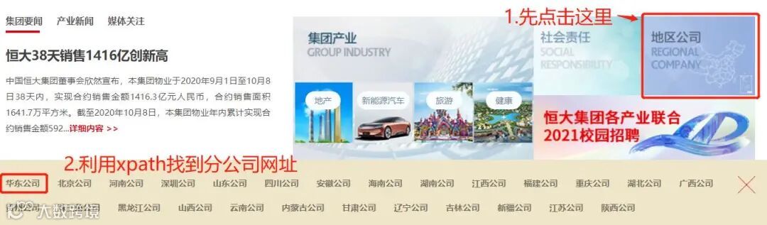 我们在官网中,找到地区公司的xpath,得到各分公司的名单并借助href属性模拟点击分公司的网址。同时,为方便后期分析,把分公司所在地区保留在region之中。这里以华东分公司为例,代码如下: