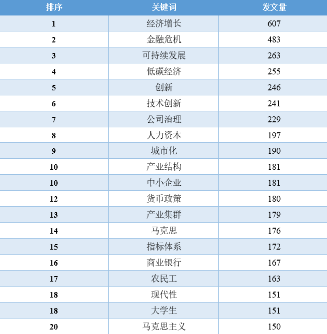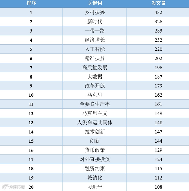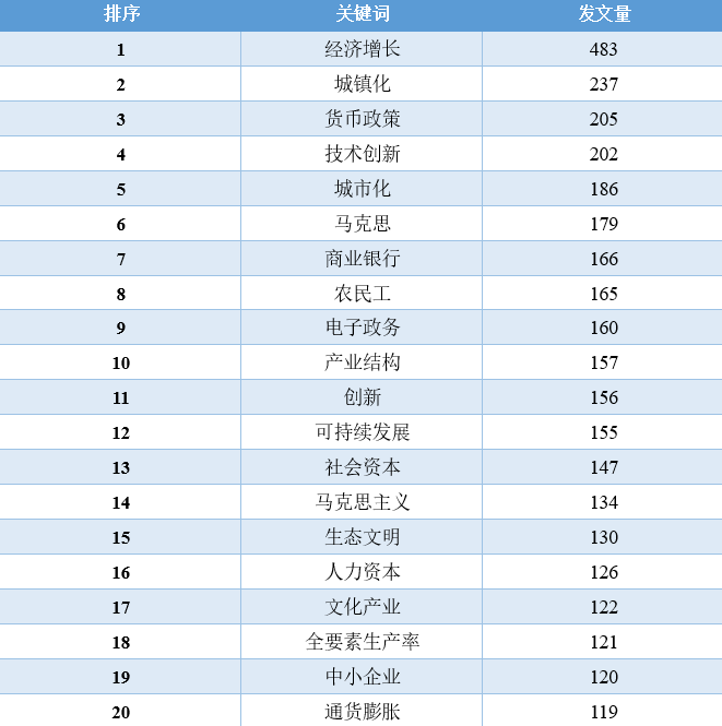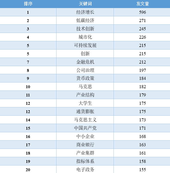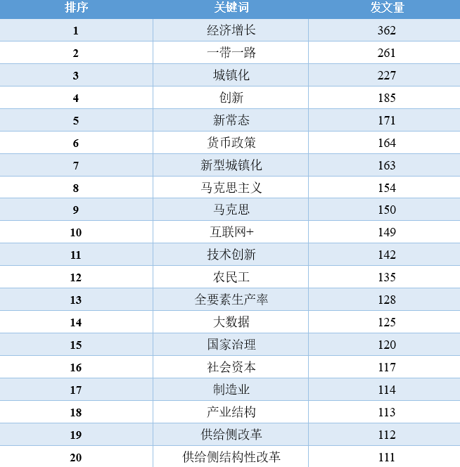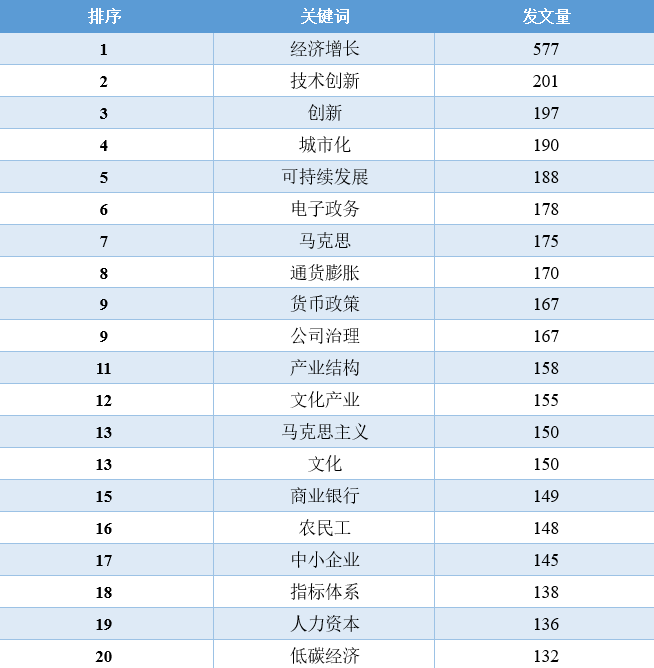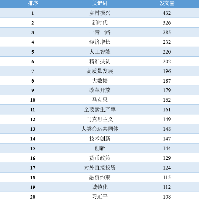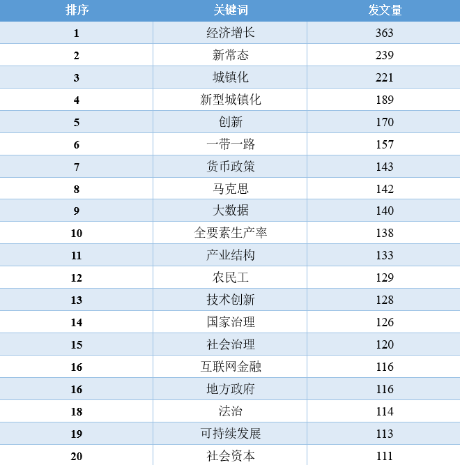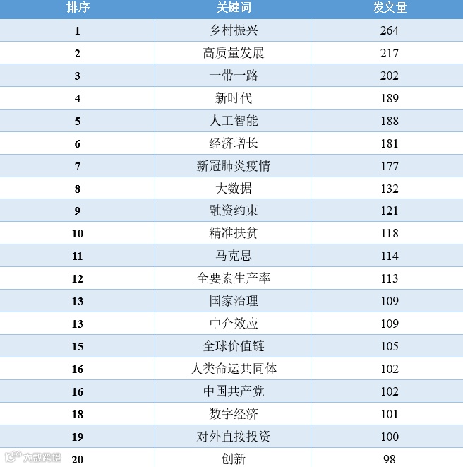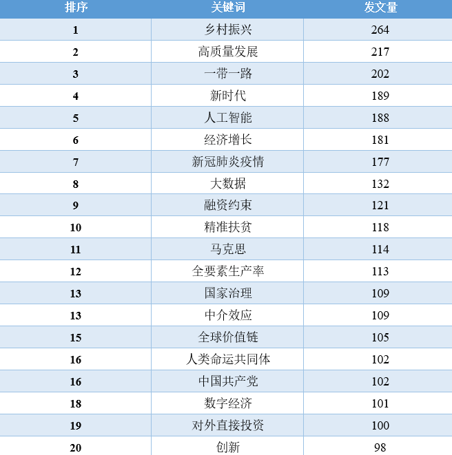 对比这11年的数据,我们可以发现,“经济增长”相关的文章数量在2010-2016年占据着绝对优势地位,从2017年开始,“一带一路”、“新时代”、“乡村振兴”、“高质量发展”等相关领域的文章数量开始逐渐超过“经济增长”的文章,同时,这些年还逐渐涌现出“低碳经济”、“新型城镇化”、“互联网+”、“人工智能”、“数字经济”等新领域、跨学科的讨论。2020年截止到目前最为突出的变化当属“新冠肺炎疫情”相关文章的增加。