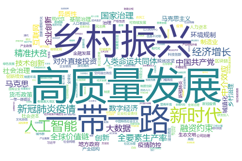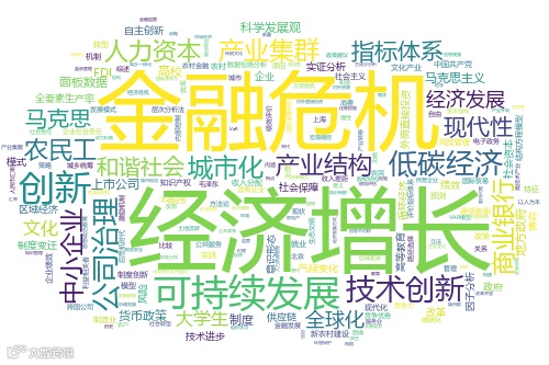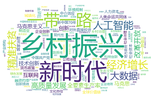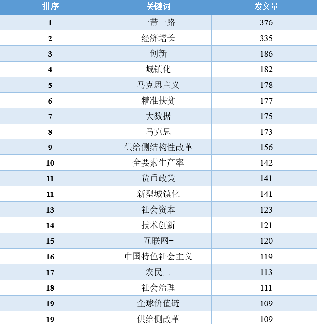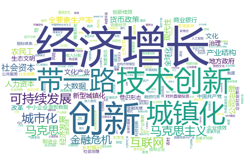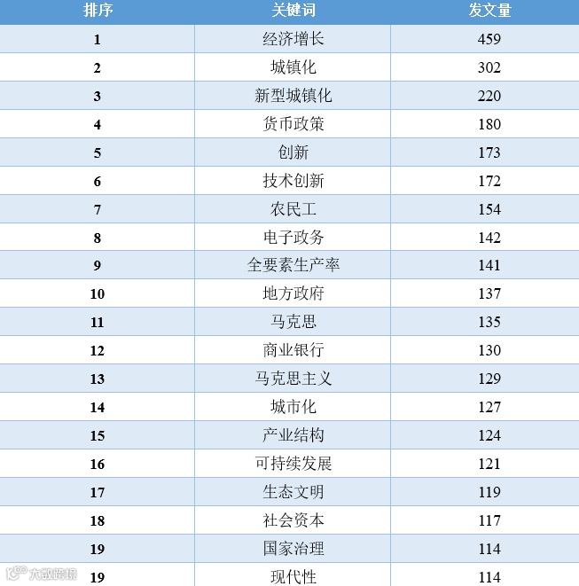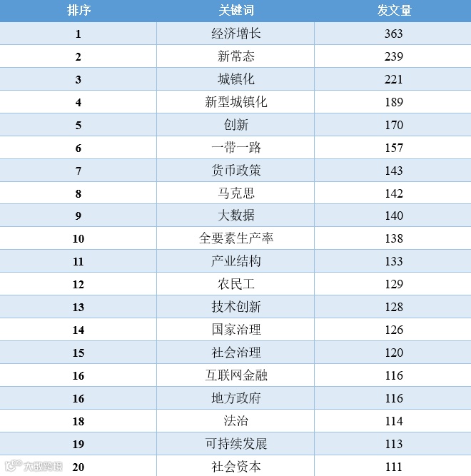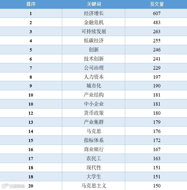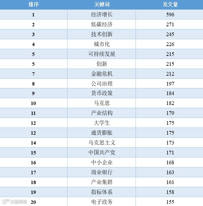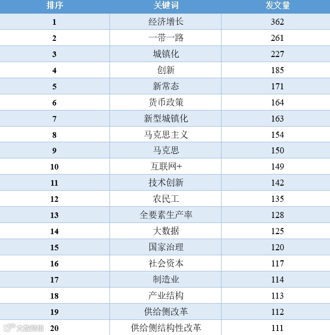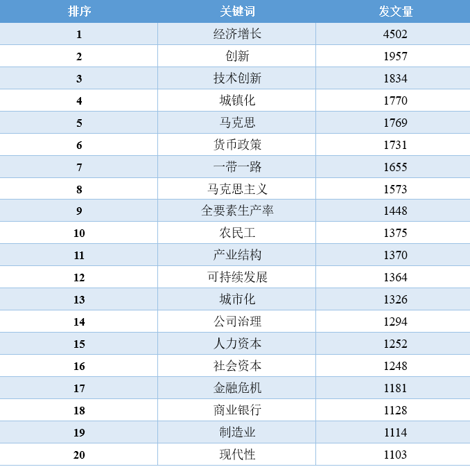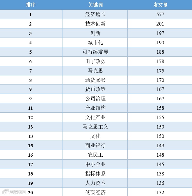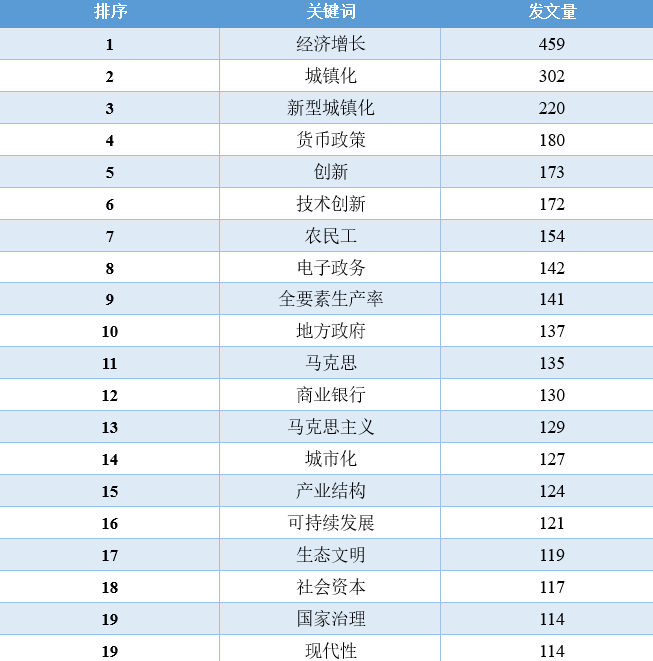 对比这11年的数据,我们可以发现,“经济增长”相关的文章数量在2010-2016年占据着绝对优势地位,从2017年开始,“一带一路”、“新时代”、“乡村振兴”、“高质量发展”等相关领域的文章数量开始逐渐超过“经济增长”的文章,同时,这些年还逐渐涌现出“低碳经济”、“新型城镇化”、“互联网+”、“人工智能”、“数字经济”等新领域、跨学科的讨论。2020年截止到目前最为突出的变化当属“新冠肺炎疫情”相关文章的增加。