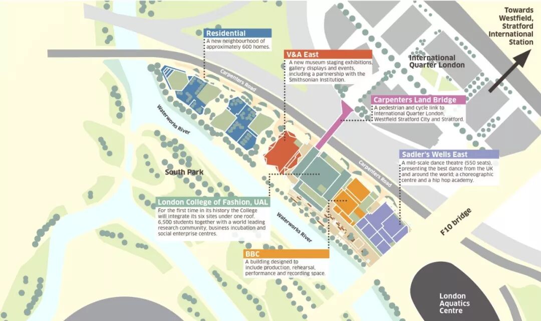 东岸将分成三个区域,分别为伦敦大学学院东部新校区“UCL East”、斯特拉福德滨水区“Stratford Waterfront”以及已经开发使用的办公区“Here East”,这其中滨水区将包括英国广播公司音乐录音室、伦敦艺术大学时装学院、V&A博物馆与史密森尼学会(Smithsonian Institution)的合作项目、沙德勒之井剧院(Sadler's Wells)等。
