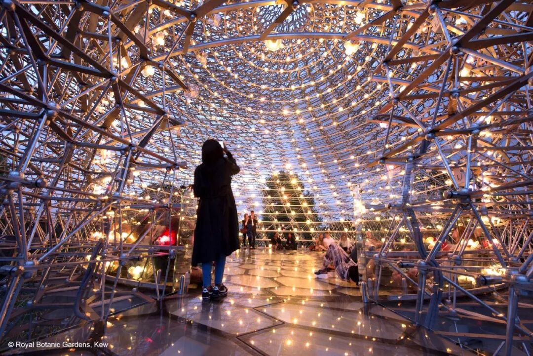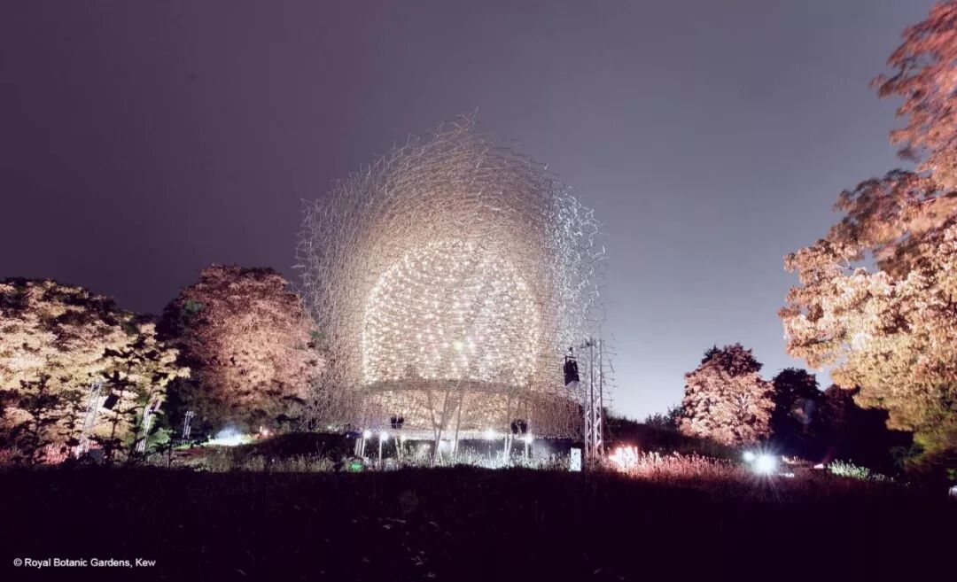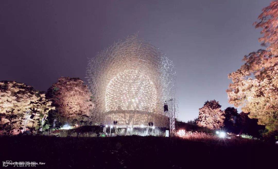 邱园里另外一个不得不提的地方是“蜂巢”(The Hive)。这个17米高的蜂巢体验装置由169300个铝构建和上百个LED灯组成,其沉浸式的听觉和视觉体验全部基于真实的蜜蜂活动。