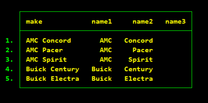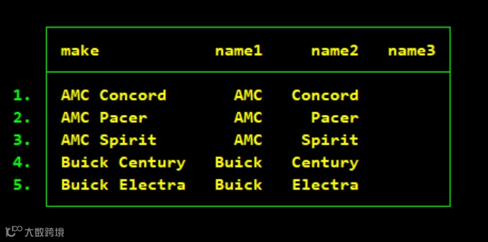 举个简单的例子,我们拿auto数据来说,我们发现数据中的汽车制造厂商名称大部分都是由两个或者三个单词构成,如果想要拆分开的话,就可以使用split。