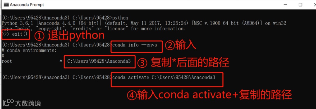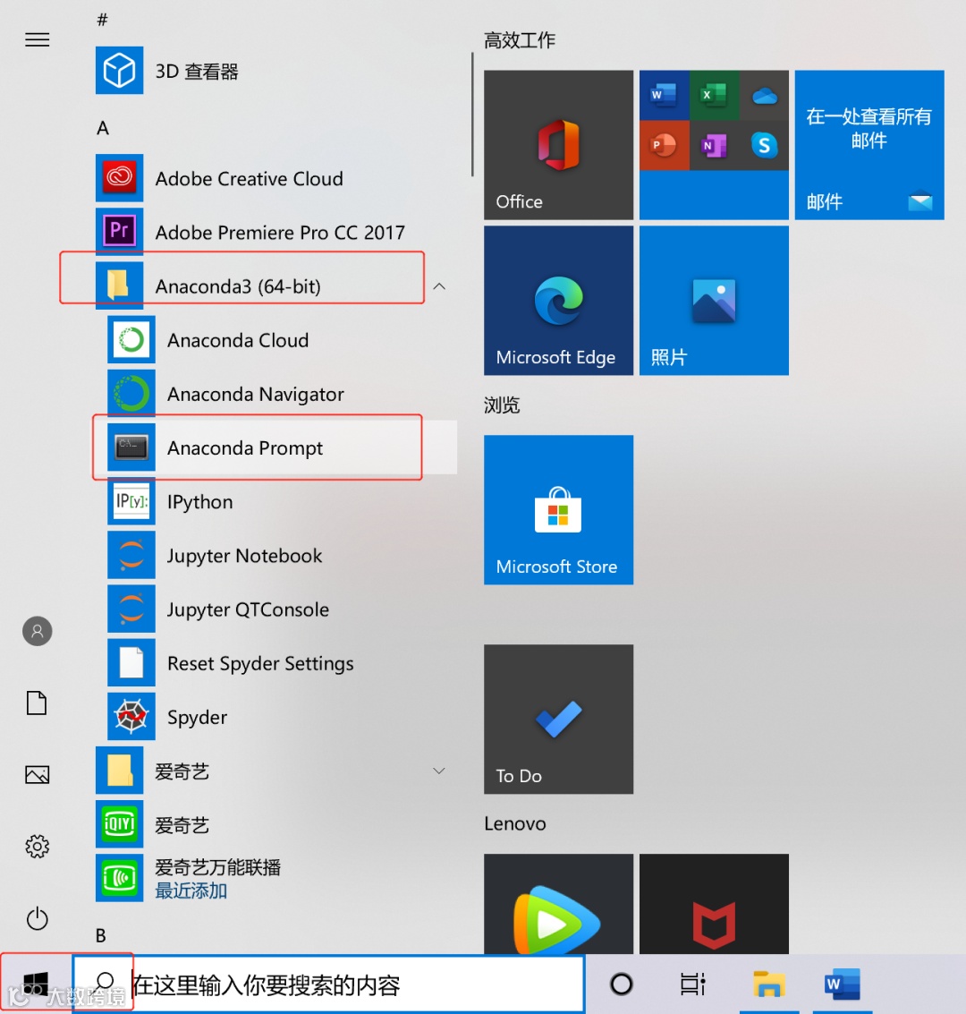 在上述操作完成后,需要确认是否成功配置了Python。我们可以在开始菜单栏找到Anaconda并点击Anaconda Prompt,进入到命令提示符的界面。