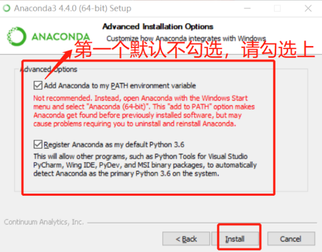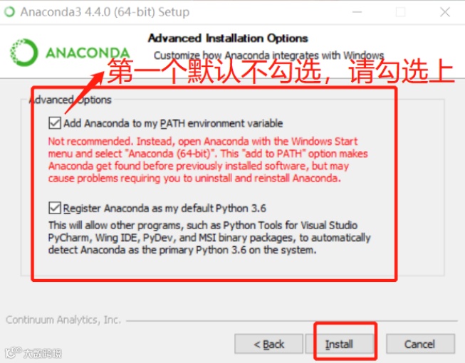 2.当操作进行到下面这一步时,一定要记住勾选第一个选项,否则之后还需要手动添加环境变量,造成不必要的麻烦。