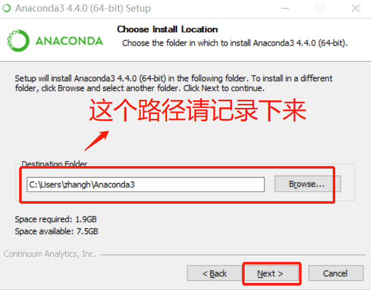 1.Anaconda的安装路径可以根据电脑内存和个人偏好进行选择,但是需要记住这里的安装路径,以免配置出现问题但忘了安装的位置。