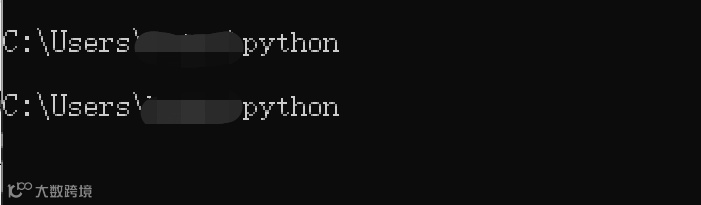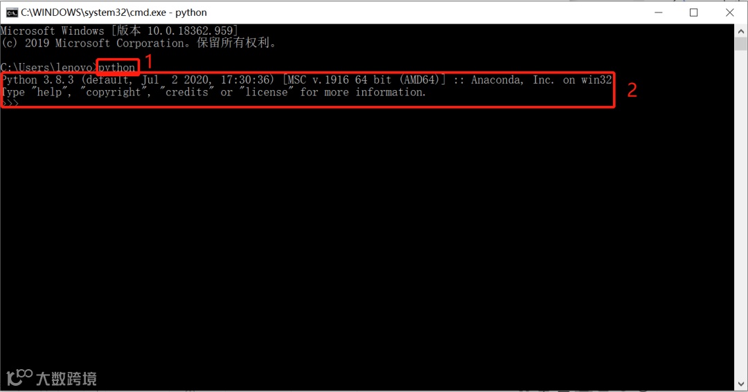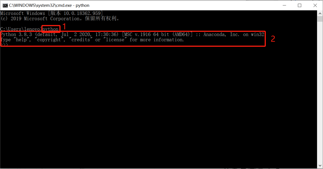 在下图位置1处输入python并回车,如果出现位置2处的字符提示,就说明安装成功~