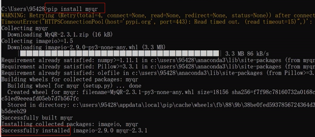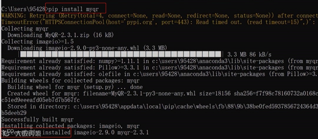 在我们使用Python的过程中经常需要使用到各种第三方库,以myqr为例,我们在第一节提到的命令提示符中输入pip install myqr,如果出现下图的响应消息,说明安装成功。