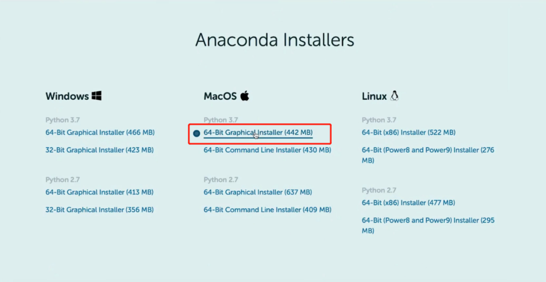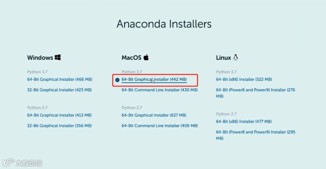 在Anaconda的下载官网可以找到Mac的安装包,网址为https://www.anaconda.com/download/,这里我们选择第一个 Graphical Installer,下载安装包大约需要15-20分钟的时间,大家耐心等待~