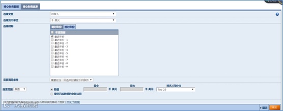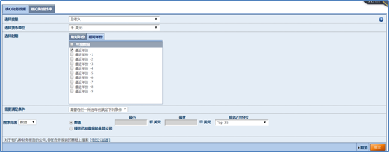 最后,点击“财务数据”“Key financials&Employees”进入如下界面,选择变量、单位、时间并将搜索范围定在“top 25”: