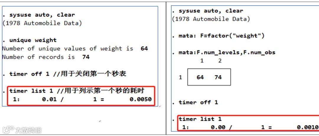 *unique命令计算变量的唯一值的数量timer clear 1 //用于复位第一个秒表的时间至 0timer on 1 //用于启动第一个秒表sysuse auto, clearunique weighttimer off 1 //用于关闭第一个秒表timer list 1 //用于列示第一个秒的耗时*ftools命令计算变量的唯一值的数量timer clear 1timer on 1sysuse auto, clearmata: F=factor("weight")mata:F.num_levels,F.num_obstimer off 1timer list 1