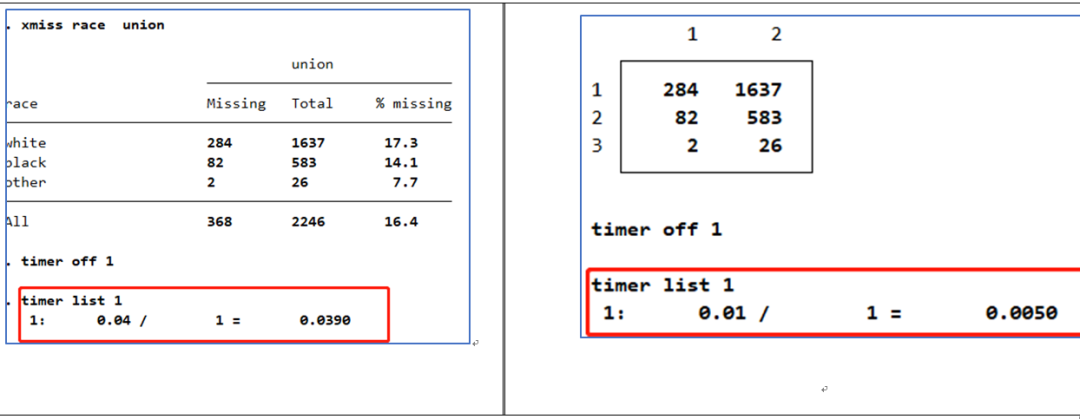 可以看出,两个程序跑出来的结果是一样的,当race=white时,缺失284个值,当race=black时,缺失82个值,当race=other时,缺失2个值,不过xmiss运行时间是ftools的8倍,说明ftools的运行速度是极快的。