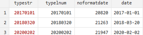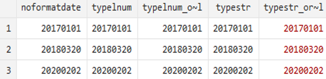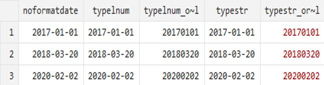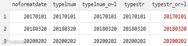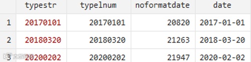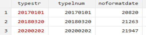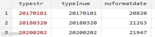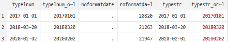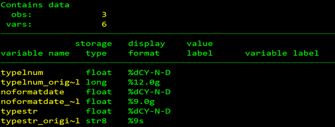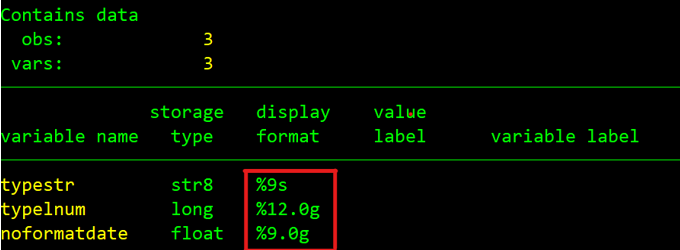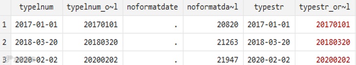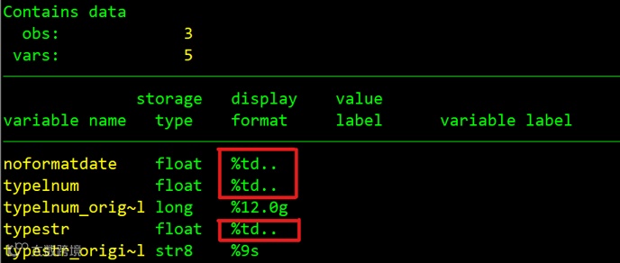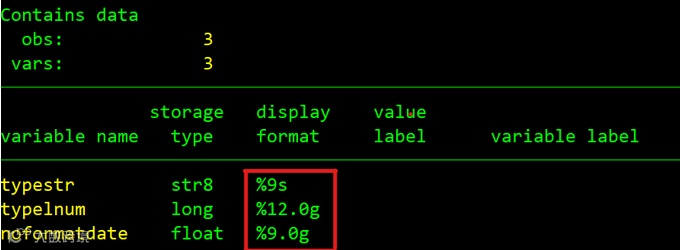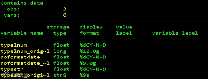可以看到变量typestr为字符型,变量typelnum与noformatdate为数值型。