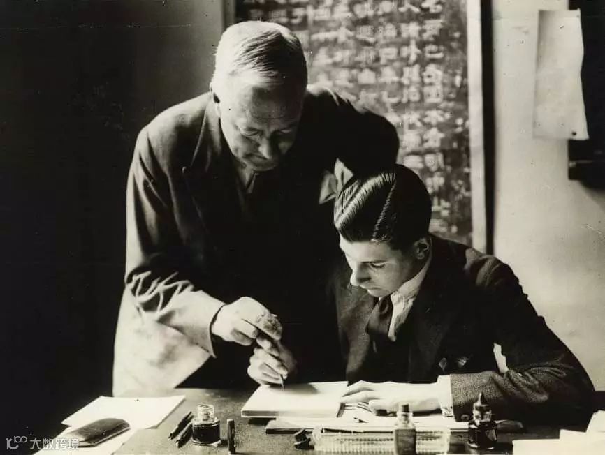 在上面这张来自伦敦亚非学院图书馆的档案照片里,汉学教授庄士敦爵士正在教学生练习古汉语书法。