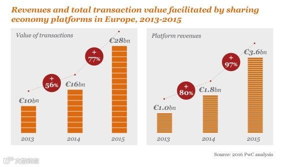 根据普华永道2016年的数据,从2013年到2015年,共享经济为欧洲带来的交易价值,从100亿欧元提高到280亿欧元;而收入从10亿欧元提高到36亿欧元。普华永道分析认为,欧洲的共享经济的增长才刚刚开始,到2025年,共享经济企业将会在许多领域与传统企业相互竞争,重点包括五个行业。