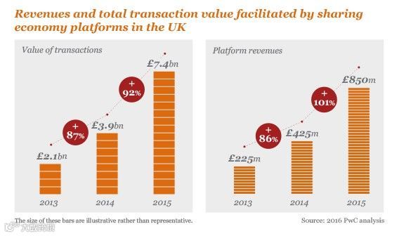 根据普华永道的数据,从2013年到2015年,共享经济为英国带来的交易价值已经从21亿英镑提高为74亿英镑,而收入从2013年的2.25亿英镑提高到2015年的8.5亿英镑。共享经济所带来的生活方式,已经深得英国民众的认可与青睐。