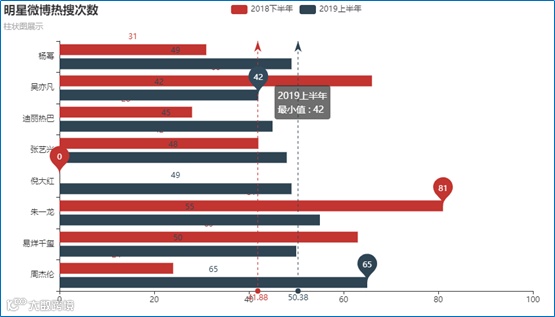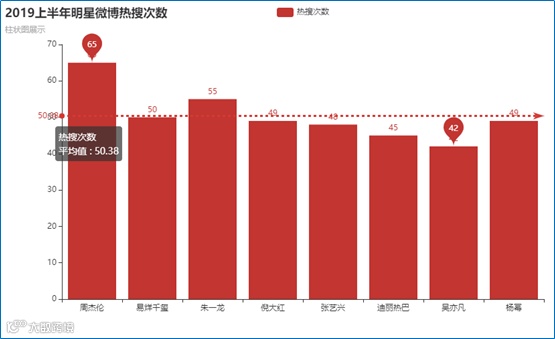 周杰伦65次,易烊千玺50次,朱一龙55次,倪大红49次,张艺兴48次,迪丽热巴45次,吴亦凡42次,杨幂49次。