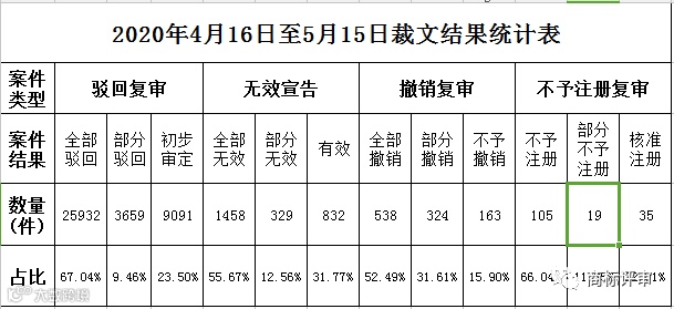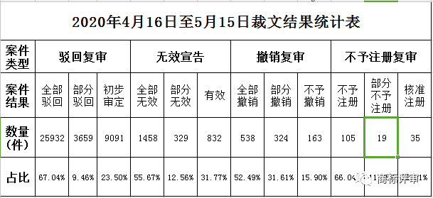 2020年4月16日至5月15日,审理签发各类评审案件42485件,同比增长51.93%,其中签发驳回复审案件38682件,同比增长55.07%,签发复杂案件3803件 ,同比增长26.01%,按换算工作量计算,同比增长40.78%。