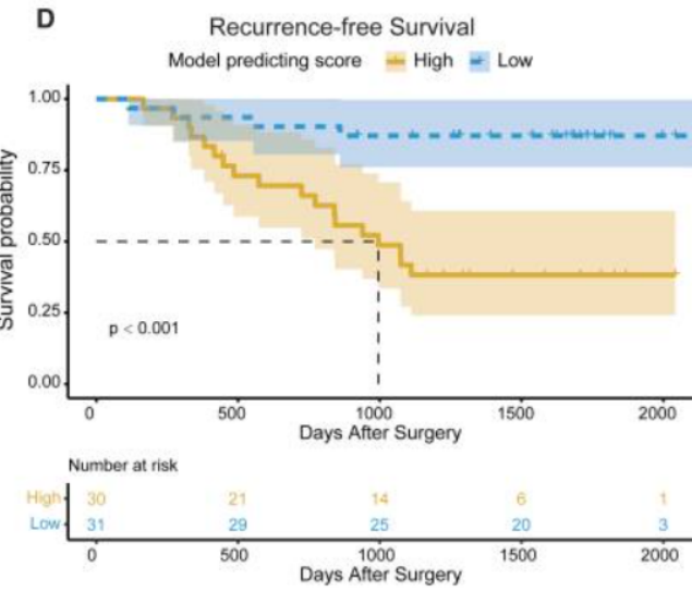 通过模型预测分数划分的高风险与低风险人群,无复发生存期存在显著差异:高风险组术后3年复发率显著升高,Kaplan-Meier生存曲线显示两组差异具有统计学意义(p<0.001)。进一步分析发现,甲基杆菌科是预测复发的关键特征,其丰度高的患者无复发生存期显著缩短(p<0.001),且模型预测分数是无复发生存期的独立影响因素(HR=27.8,p=0.001),可补充现有TNM分期的预后评估能力,为临床制定个体化辅助治疗方案提供参考。