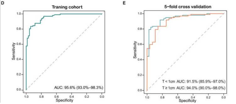 (二)基于差异cmDNA特征构建的肺癌诊断模型表现出优异的检测性能。模型以 119 个差异物种为输入,在训练集中AUC达95.6%(95% CI:93.0%-98.3%),灵敏度 81.2%、特异性 90.7%;针对微小肿瘤(直径 < 1cm)的检测能力尤为突出,5 折交叉验证中 AUC 达 91.5%,与较大肿瘤(≥1cm)的 94.0% 接近,解决了早期肺癌检测灵敏度不足的痛点。