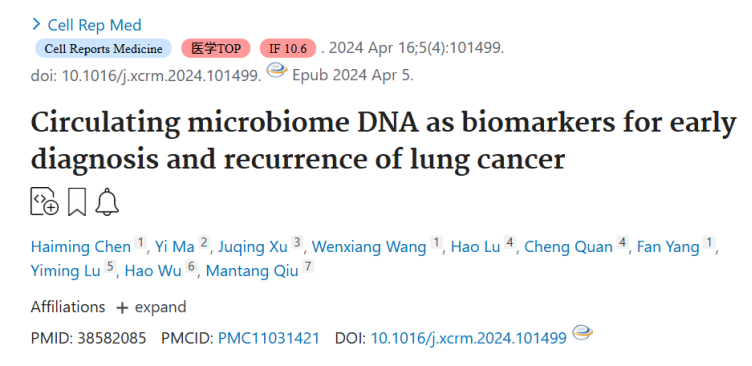本文标题为《Circulating microbiome DNA as biomarkers for early diagnosis and recurrence of lung cancer》由 Haiming Chen、Yi Ma、Juqing Xu等作者共同撰写,本文首次系统探究循环微生物组DNA(cmDNA)在肺癌中的特征及应用价值,通过对 血浆样本进行全基因组测序,识别出肺癌患者与健康人群间差异富集的微生物物种,构建基于 cmDNA 的肺癌诊断模型和术后复发预测模型。其中诊断模型在独立验证集中AUC达93.2%,对 I 期肺癌和直径<1cm 肿瘤的检测灵敏度分别为 86.5%和87.1%;复发预测模型在测试集中AUC为80.9%,可有效区分术后复发高风险人群,为肺癌早期筛查和预后评估提供了全新的非侵入性生物标志物方案,同时建立了癌症液体活检的新范式。