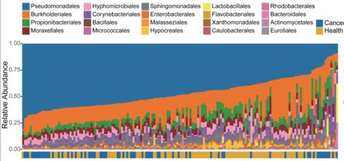 (一)肺癌患者与健康人群的 cmDNA 谱存在显著且稳定的差异特征。通过物种丰度分析、多样性比较证实,肺癌组微生物多样性(Shannon 指数、Simpson 指数)显著低于健康组,且在目、属、种多个分类水平均存在差异类群富集——假单胞菌目、不动杆菌属及假单胞菌属等物种在肺癌患者中丰度显著升高(p<0.001),而棒状杆菌目、镰刀菌属等在健康人群中更富集。