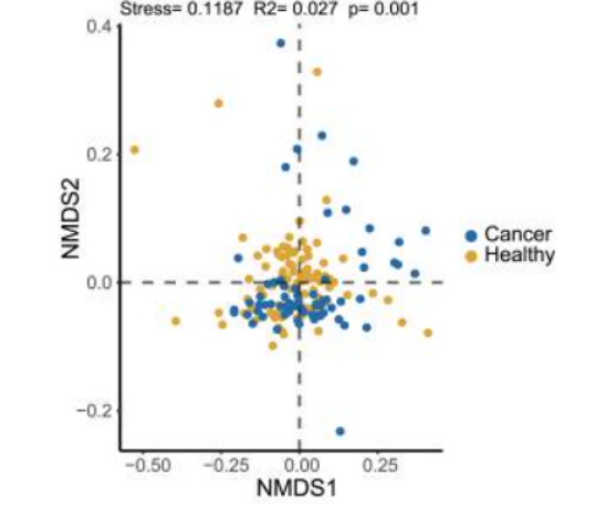 值得注意的是,这些差异特征在不同肿瘤大小(<1cm vs ≥1cm)和分期(I期vsII-IV期)患者中保持一致,未因肿瘤进展阶段出现明显波动,证实 cmDNA 改变具有肺癌特异性,为后续模型构建提供了稳定的特征基础。同时,基于Bray-Curtis距离的NMDS分析显示,肺癌组与健康组的cmDNA β多样性呈现显著分离(Adonis R²=0.027,p=0.001),进一步验证了两组微生物组成结构的本质差异。