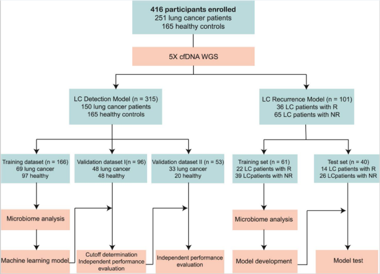 微生物组与肿瘤发生发展密切相关,肺部微生物群落可调控肿瘤进程,不同病理类型肺癌微生物组成存在差异。cmDNA已在多种癌症检测中获初步验证,但肺癌领域的cmDNA早期检测和复发预测研究仍属空白,现有肺癌生物标志物也存在不足,亟需新型非侵入性标志物。
