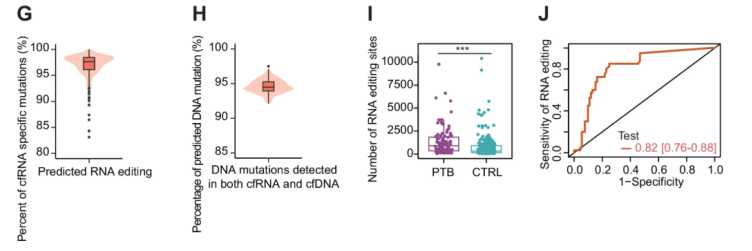 RNA 编辑模型(图F-J):DEMINING识别的RNA编辑位点96.9%为 cfRNA特异性(图 4F-G),且早产组RNA编辑位点数量显著多于足月组(图4I);基于RNA编辑的随机森林模型AUC 0.82(95% CI: 0.76-0.88),优于单组学随机森林,进一步证实多组学整合(cfRNA 编辑与cfDNA变异关联)的价值。